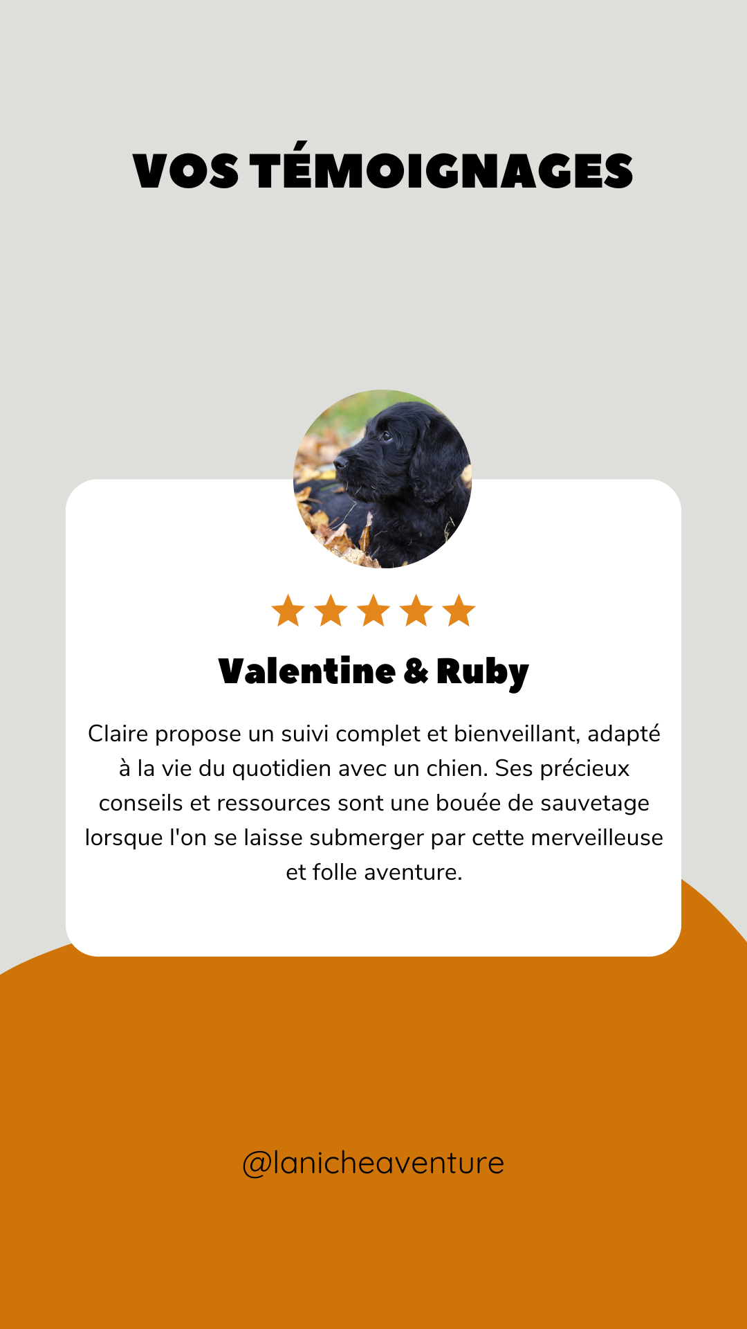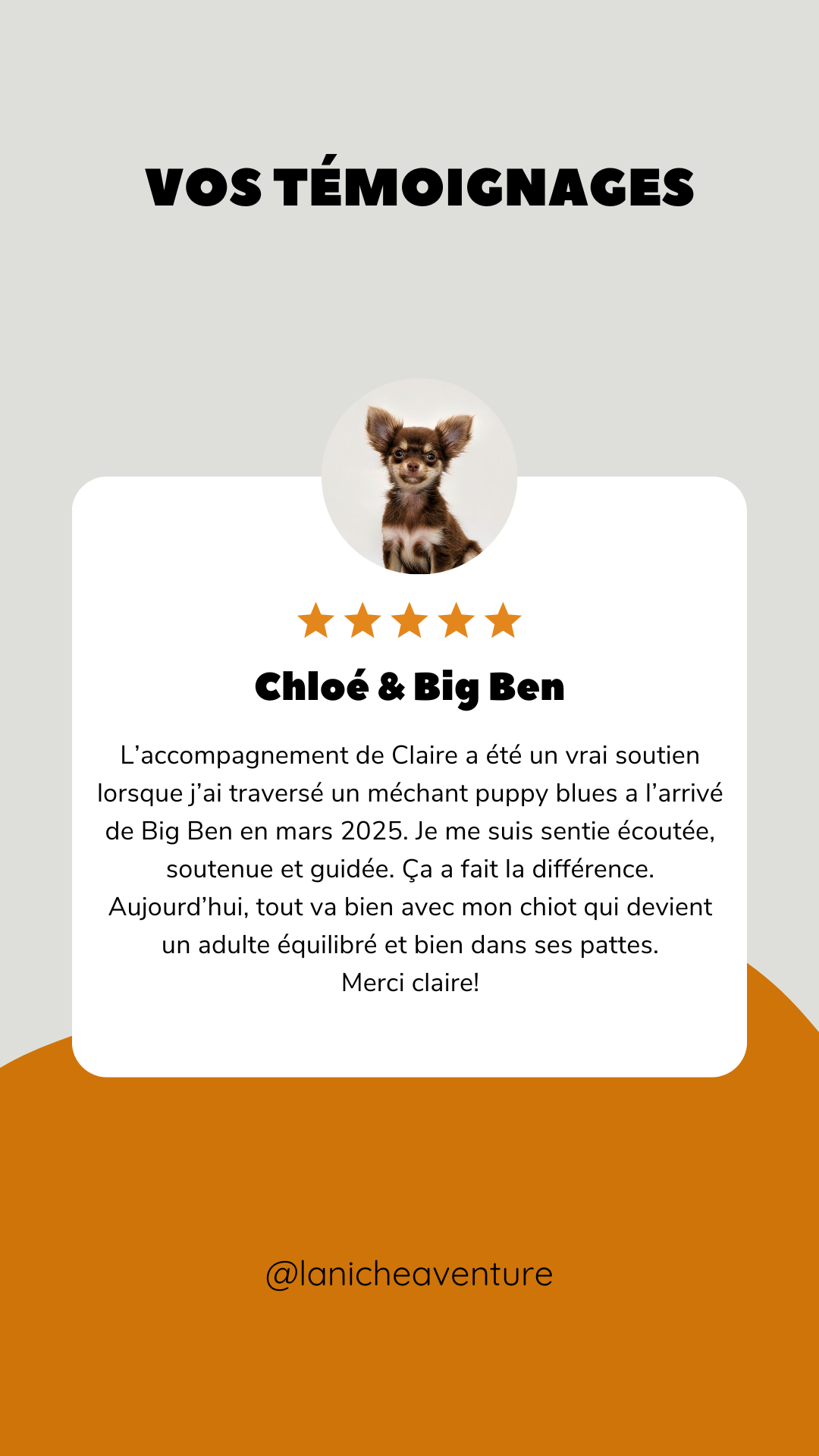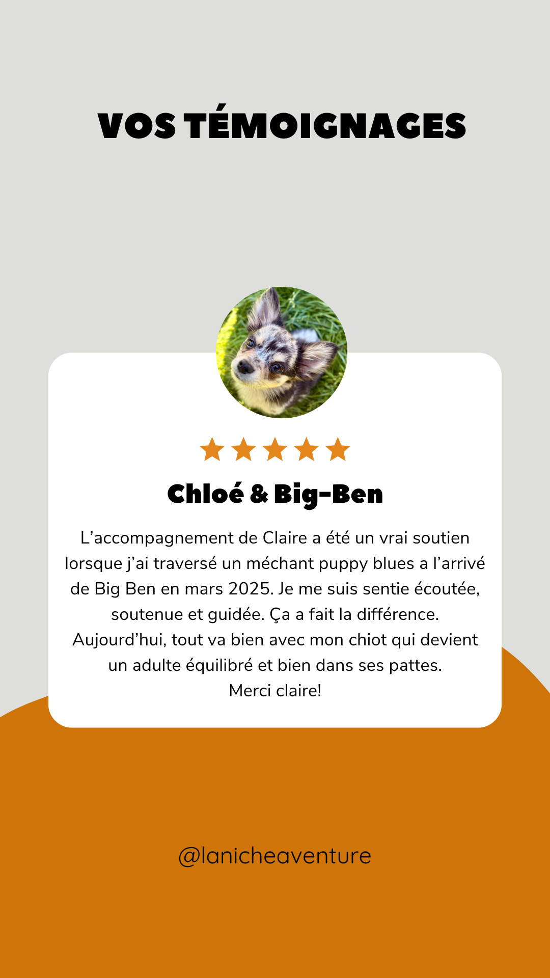 Tu viens d’adopter un chiot et tu veux prendre un bon départ avec lui ? Tu te sens dépassé par certains comportements de ton chien ? Tu voudrais développer une super connexion avec lui et vivre plein de moments fun ensemble ? Tu cherche une oreille attentive qui te soutien à chaque étape de cette aventure ?